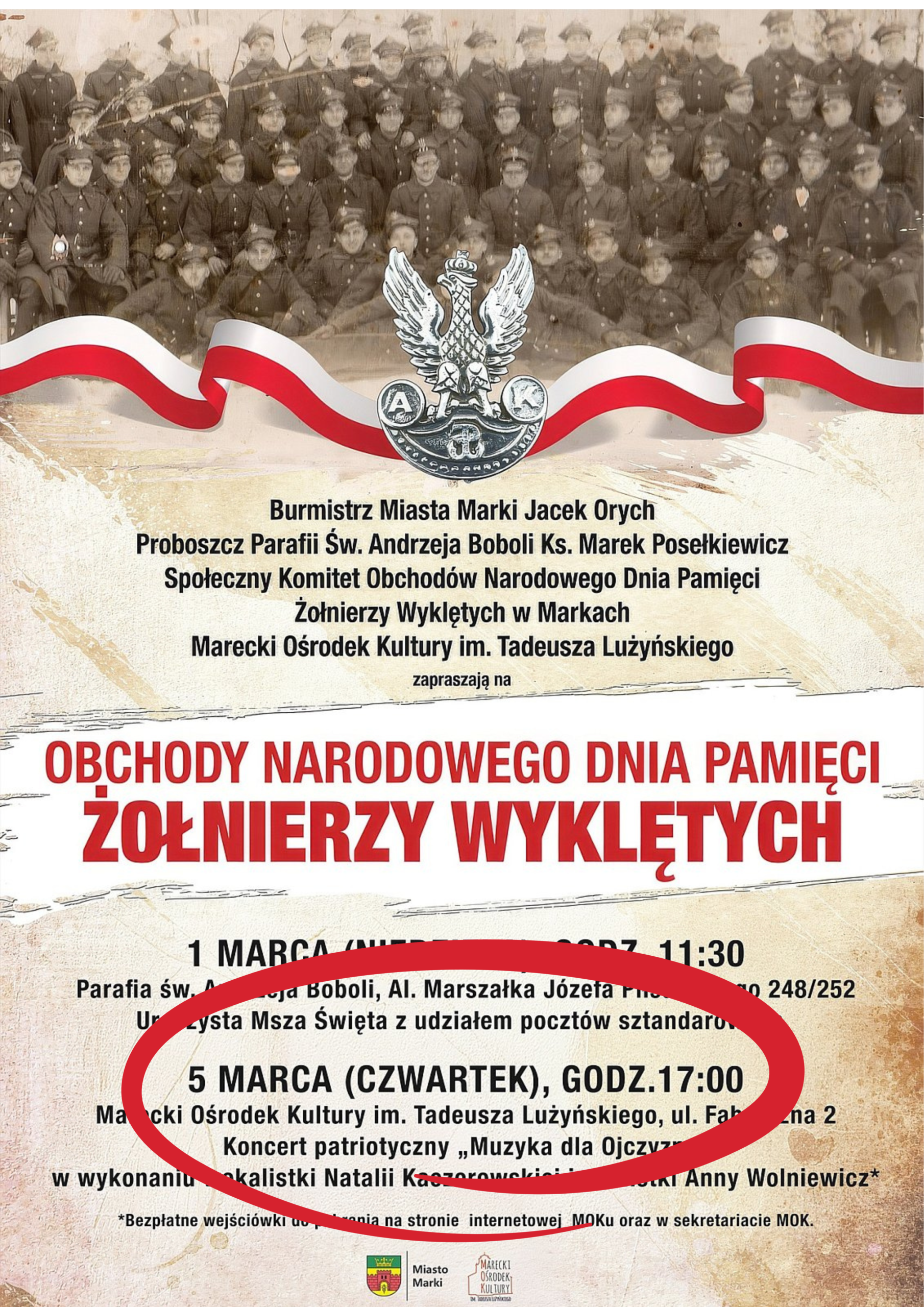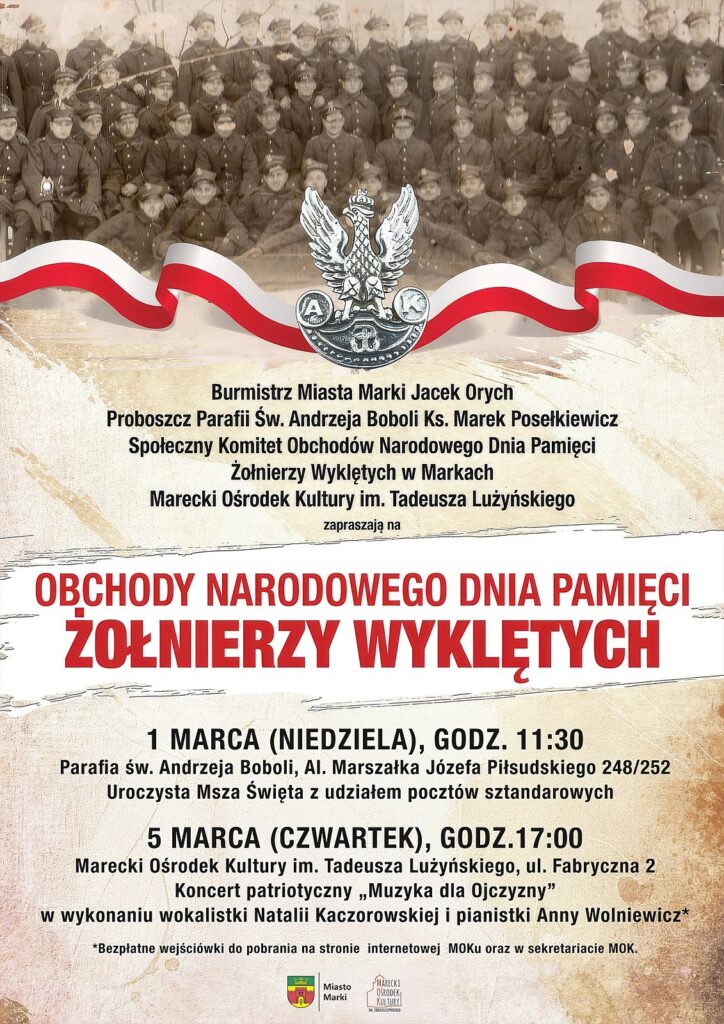 Koncert patriotyczny z okazji Narodowego Dnia Pamięci Żołnierzy Wyklętych 2026-03-05 czwartek 17:00 MUZYKA DLA OJCZYZNY w wykonaniu wokalistki Natalii Kaczorowskiej i pianistki Anny Wolniewicz bezpłatne wejściówki do pobrania: www.mokmarki.pl, w sekretariacie MOK, ul. Fabryczna 2